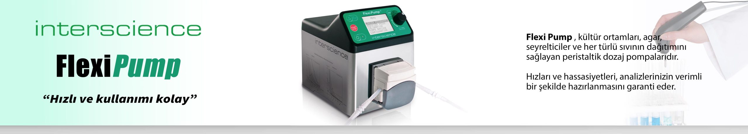 Flexi Pump, seri seyreltmeler için peptone su tüplerinin hazırlanmasında kullanılır. Petri kaplarına 18 mL agar ortamının dağıtılmasını sağlar. Gıda, çevre, ilaç, kozmetik, veterinerlik sektörlerinde ve kamu araştırma enstitülerinde kullanılır.