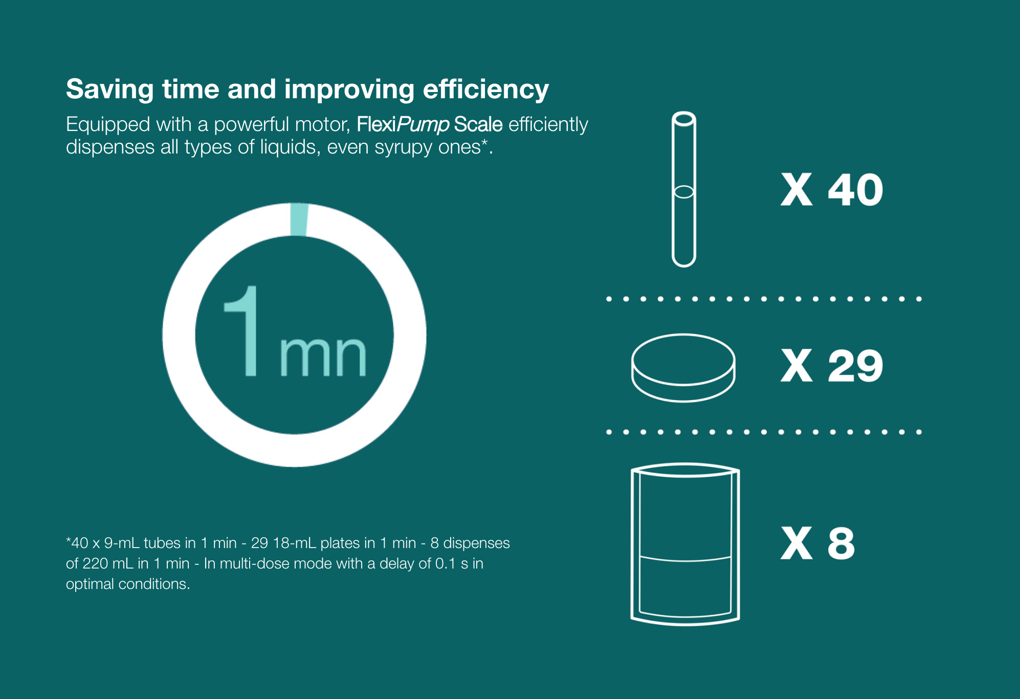 Flexi Pump Scale , her türlü ortam ve sıvıyı steril koşullar altında hızlı ve kolay bir şekilde dağıtmak için tasarlanmıştır. Kontaminasyon kaynaklarını ortadan kaldırarak, çapraz kontaminasyon içermeyen sıvı transferini garanti eder.