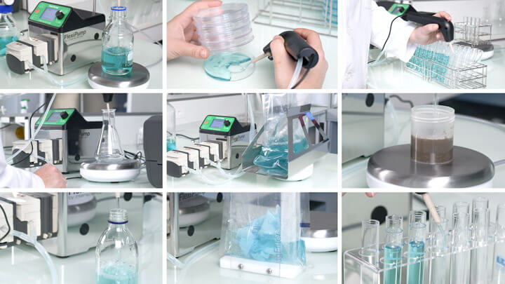 Flexi Pump Scale, gıda, çevre, ilaç, kozmetik, hayvan sağlığı ve kamu kurumları sektörlerinde seri dağıtım (seyreltme tüpleri, şişeler, kavanozlar, şişeler, filtre torbaları, numune torbaları vb.) ve Petri kaplarının doldurulması için kullanılır. Özellikle büyük bir test tüpünden büyük hacimli seyrelticiyi dağıtmak veya PCR için örnekleme mendilleri hazırlamak için çok uygundur. Ayrıca toprak ve kanalizasyon çamuru analizleri için numune hazırlamakta da kullanılır.